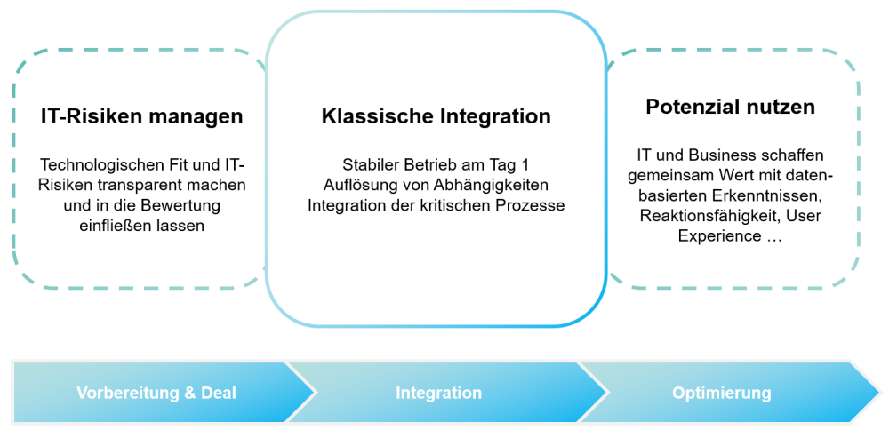 - Risiken senken: IT-Risiken und Integrationskosten frühzeitig identifizieren, bewerten und in die Deal-Logik integrieren.