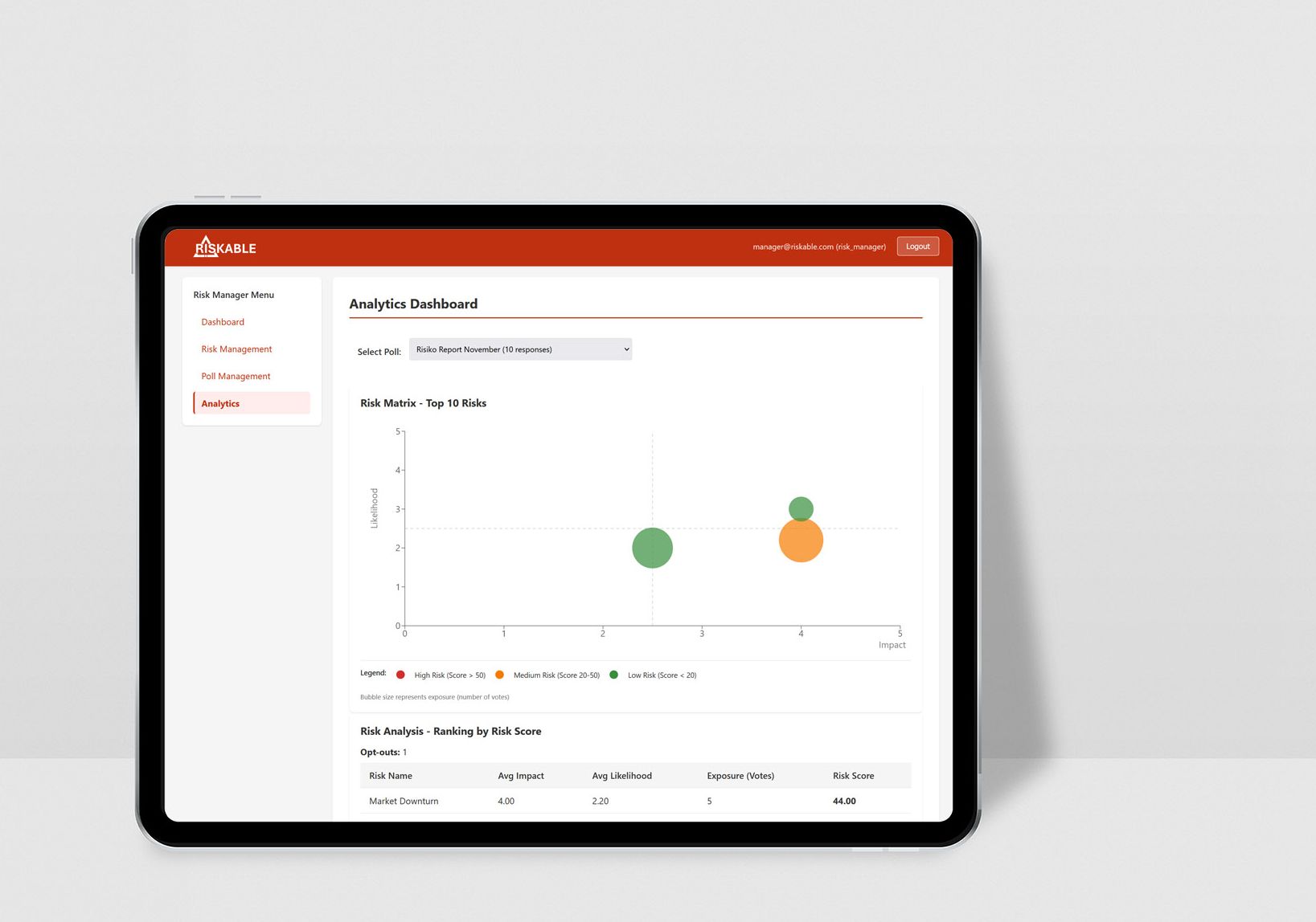 Mit unserer Anwendung Riskable können wir mehr Perspektiven als zuvor möglich war zusammenfassen und in die Risikobetrachtung einbeziehen. So vermindert sich das Risiko, dass Risiken untergehen oder aus politischen oder psychologischen Gründen nicht gennant werden.